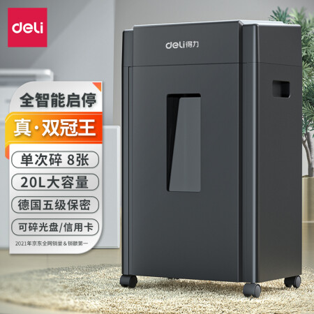 得力 deli 5級(jí)保密辦公商用碎紙機(jī)(單次8張 20L 持續(xù)10分鐘 可碎卡碎光盤)33043