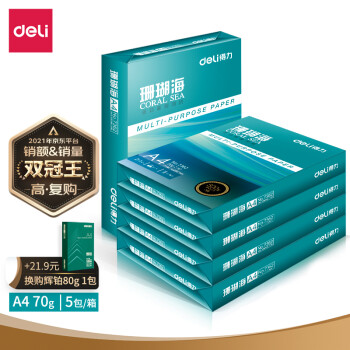 得力(deli)珊瑚海 A4 70g 雙面打印紙 行業(yè)熱銷復(fù)印紙 500張/包 5包1箱(整箱2500張)